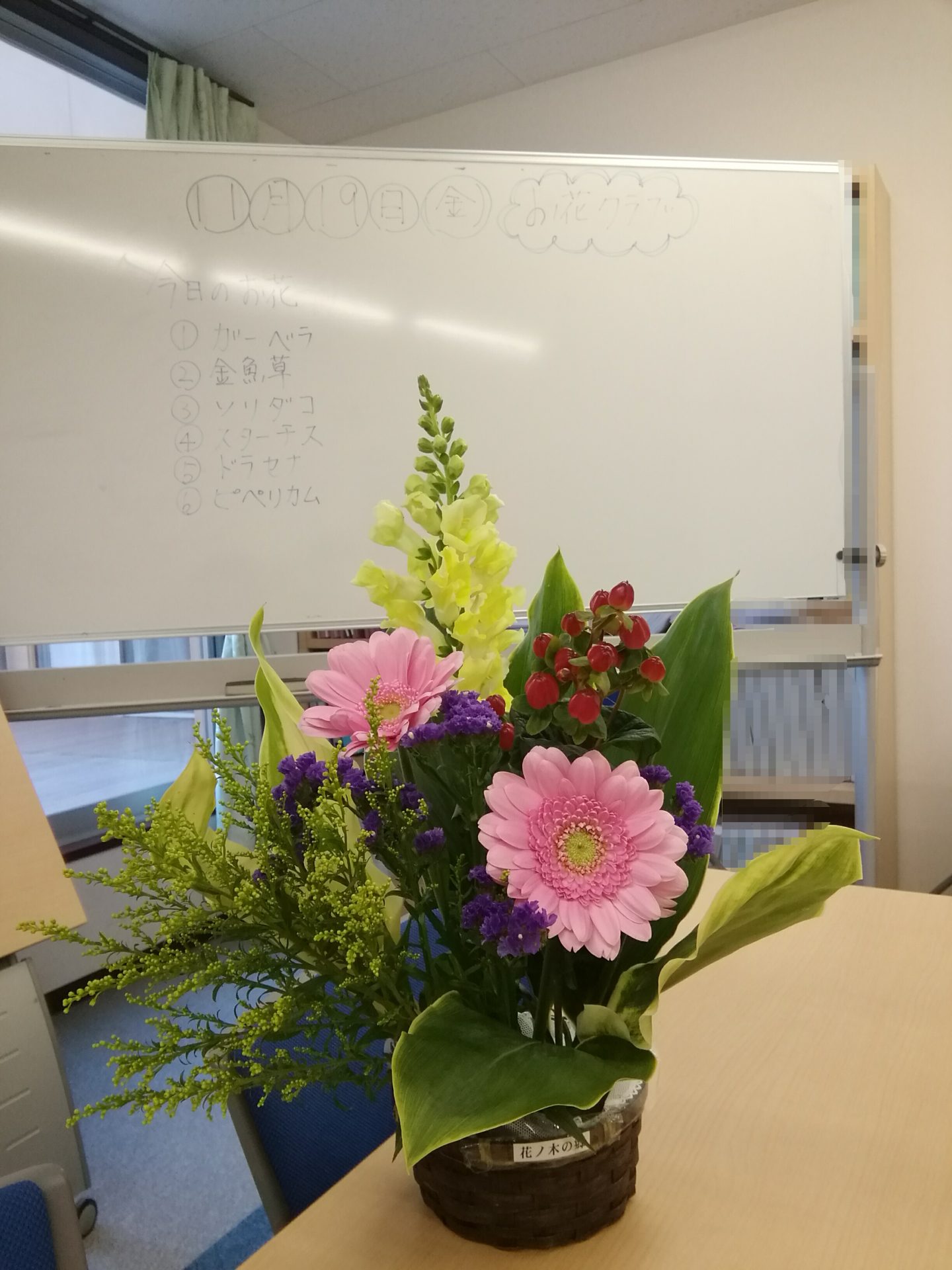 イベントアルバム お花クラブ🌺 calendar_today 2021/11/23 今月のお花クラブです💛 お花の名前を、後ろのホワイトボードに書いてくれました❤ ①ガーベラ ②金魚草 ③ソリダコ ④スターチス ⑤ドラセナ ⑥ピペリカム 今月は、1階、2階の方です🌷