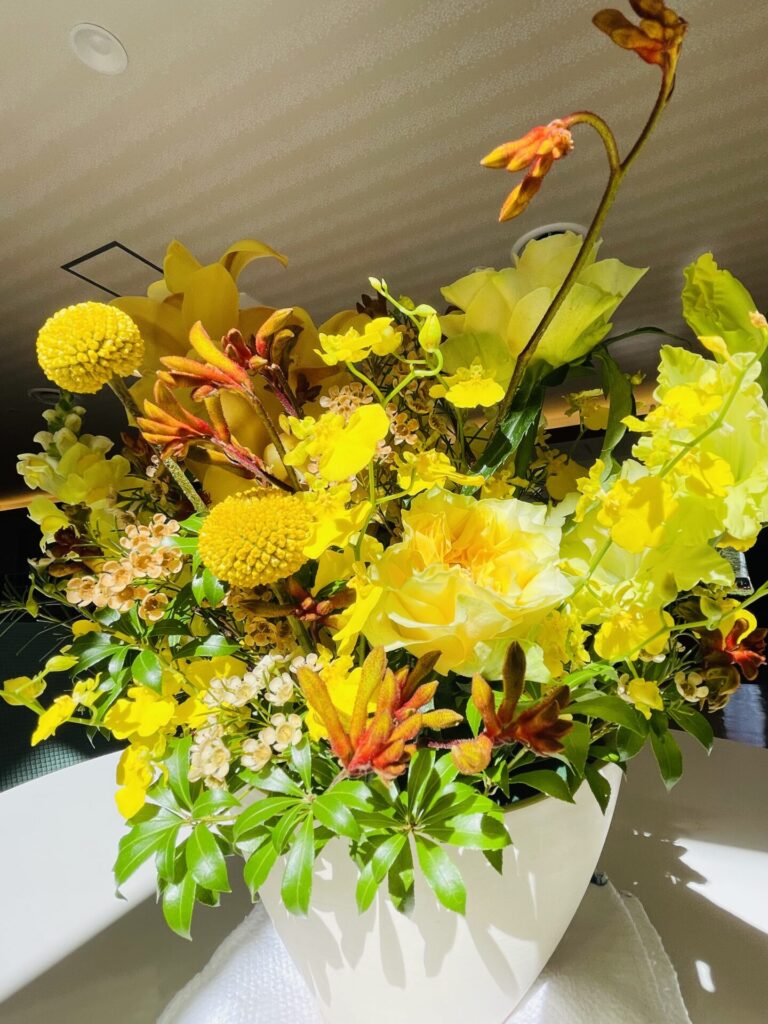 イベントアルバム キレイなお花🌺 calendar_today 2025/11/03 11月に入り、初めてのお花が届きました。 前回とはまたイメージが違う感じですね✨ 今回のお花の種類は… シンビジウム カンガルーポー スナップ ワックスフラワー オレンジューム バラ”レモンフォセット” クラスペディア となっています。 皆さん、どれがどの花か分かりますか? 今回は、日向ぼっこ中であった営業部長と一緒にで記念撮影してみました😊