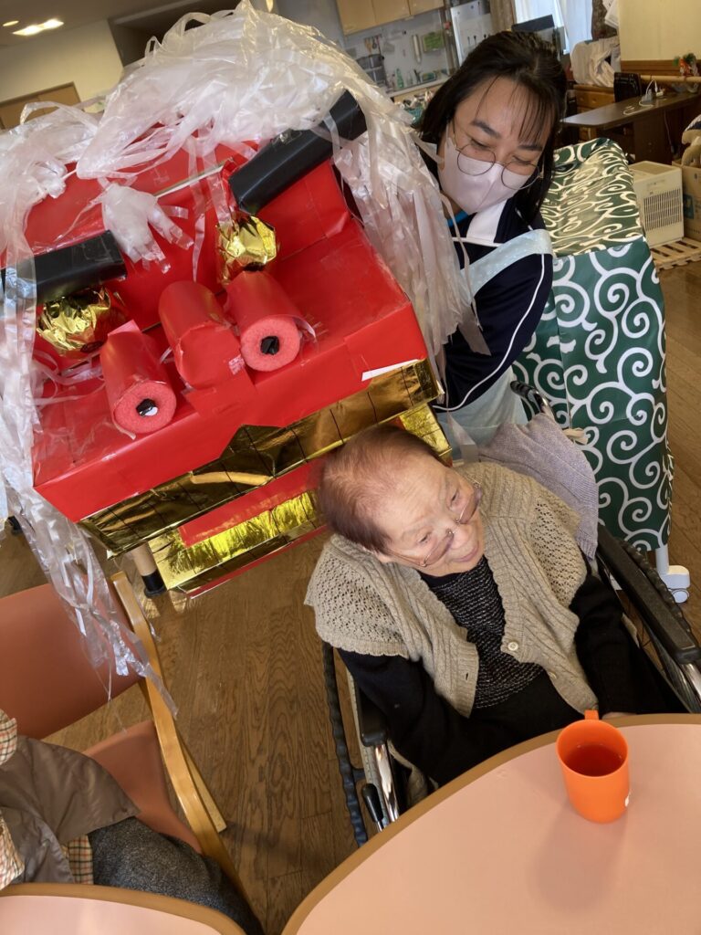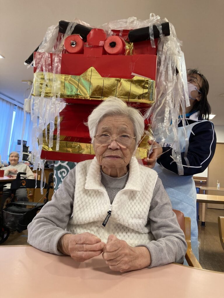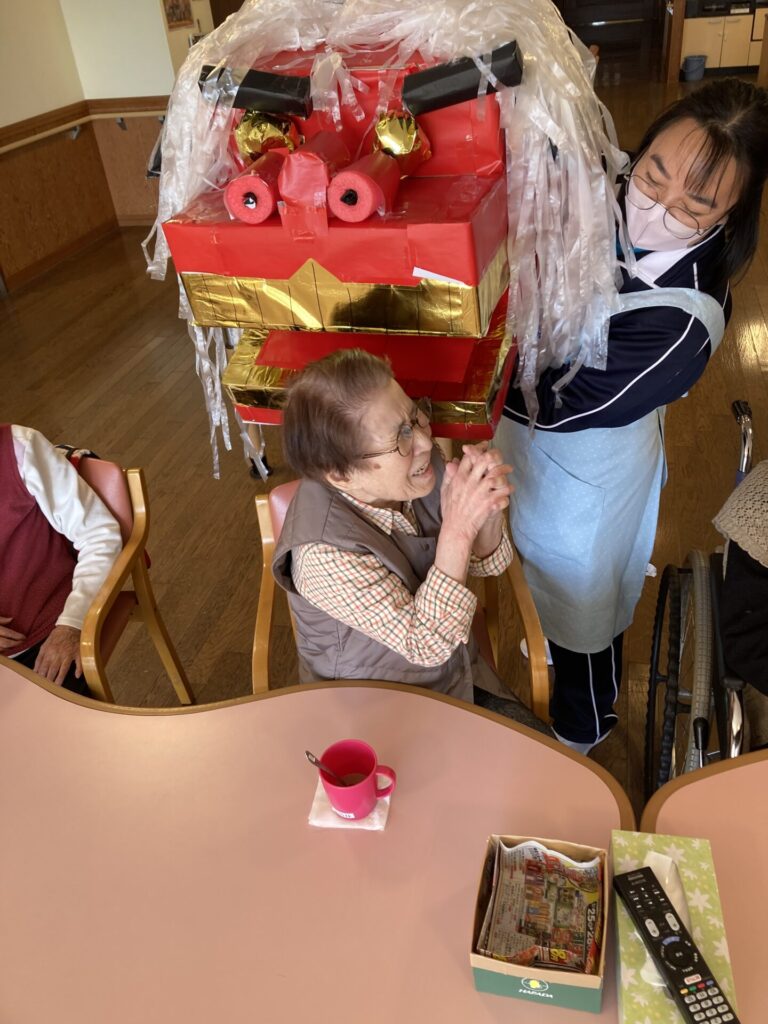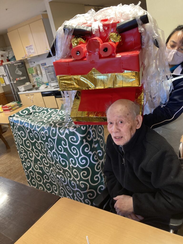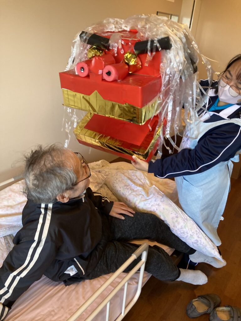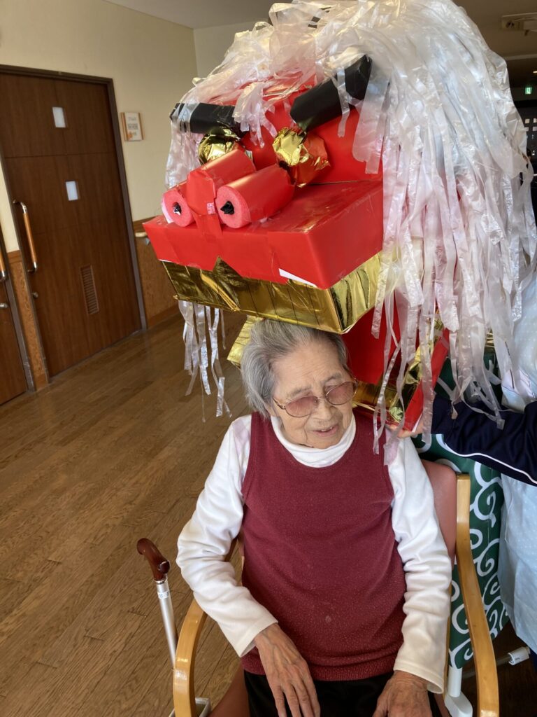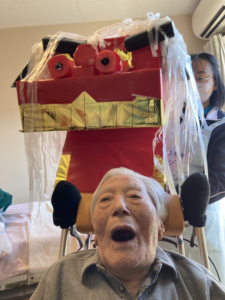 実習生さんが、獅子と一緒に、入居者様のもとへ…