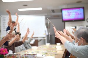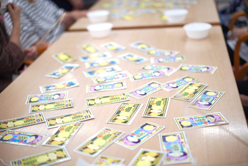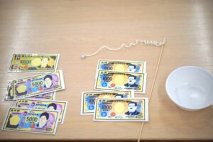 イベントアルバム マネーゲームに目がくらむ💰 calendar_today 2025/10/18 このゲーム めちゃくちゃ盛り上がっていました わー! 目の前にはたくさんの札 札 札 フライングしないように 「ヨーイ」 で 皆さま両手を上に 釣り竿持って 釣ります! 釣ります!! どんどん釣ります!!! 大金GET!! なゲームですから、皆さま一枚でも多く もっともっと って真剣に釣って 楽しんでいました