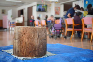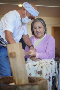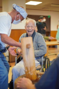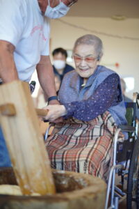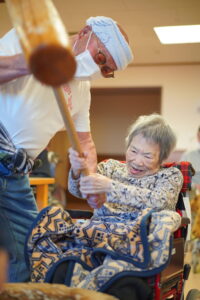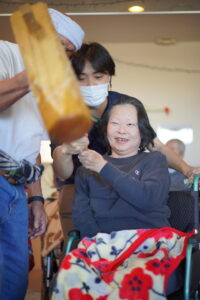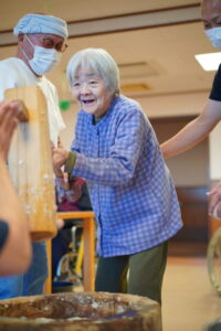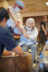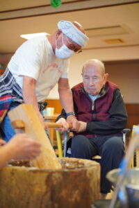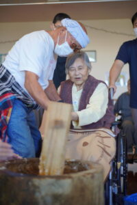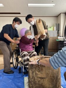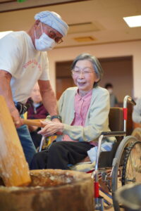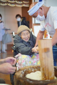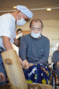 重たい杵なので、職員がサポートして デイサービスご利用の皆さまには順番についていただきました![]()