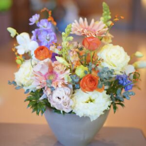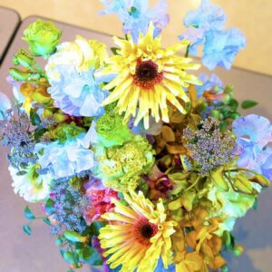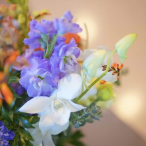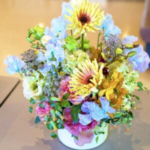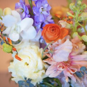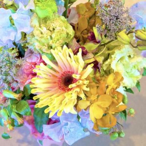 ストック”アイアンマリン” ・ガーベラ”パスタロサート” ・ ラナンキュラス”エムオレンジ” ・ リシアンサス”ボヤージュピンク” “ボヤージュイエロー” ・ デンファレ ・ スカビオサ ・ クロコスミア ・ スイートピー